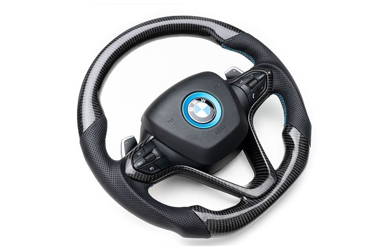 Click to Enlarge [受注生産モデル]BM-i8-CPBS CarbonFiber/Perforated Leather/BlueStitch 強靱な多層クリアコーティングを施したカーボン(東レ製)とパンチングレザーを組み合わせたモデルグリップ部はフィッティング良好なガングリップ形状スポーティーさを強調したセミDシェイプステッチは" i "らしさを演出するブルーステッチ ASK(SpecialOrder) 【適合車種】i8 (ロードスター含む) ※本製品は希少性の高い純正ステアリングを使用するため納品までにお時間を頂戴致します。お客様のステアリングをお預かりしての製作も可能です(納期2か月~) Gallery※一部市販オプションパーツ組み合わせ Back to ProductTOP